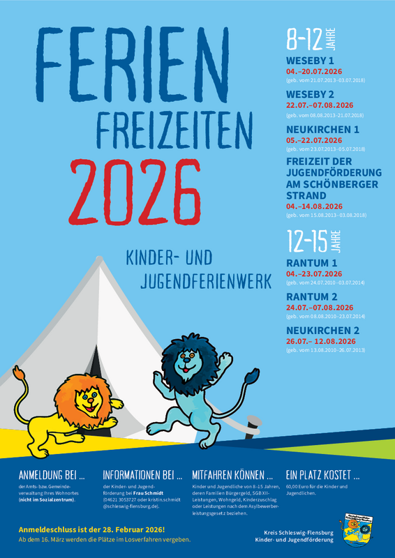 Bei einer Eigenbeteiligung der Erziehungsberechtigten in Höhe von 60,00 EURO stehen Plätze in den folgenden Ferienlagern durch das Kreisjugendamt zu Verfügung: